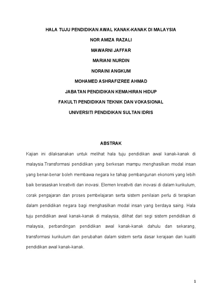 Haja Tuju Pendidikan Kanak Di Malaysia Kumpulan 5 Pdf